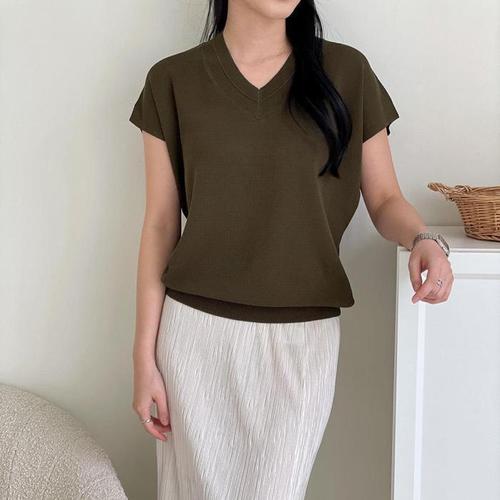 [신상오픈런]브이넥 가오리 여성 시보리 캡소매니트 반팔티셔츠 (31646260)