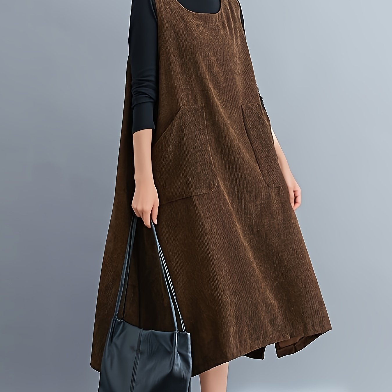 TEMU 봄가을 우아한 여성 드레스 빈티지 문학적 미디엄 기장 코듀로이 베스트 드레스 루즈핏 대형 포켓|여성원피스|나시원피스|인견원피스