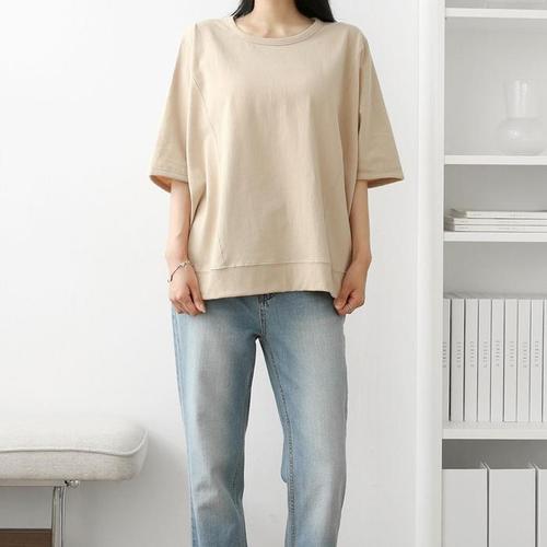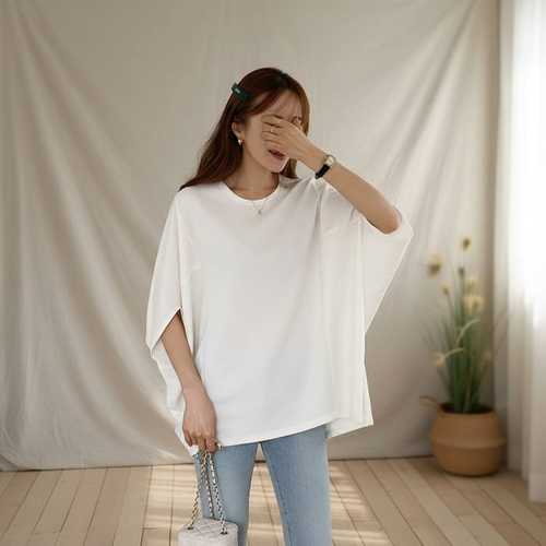 [신상오픈런]여자 무지 가오리 반팔 절개 라운드넥 오버핏 티셔츠 (36389260)