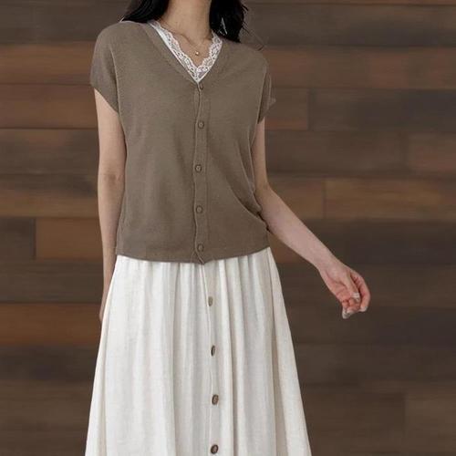 [신상오픈런]여성 린넨 버튼 가디건 브이넥 여름 반팔 가오리핏 (38767690)