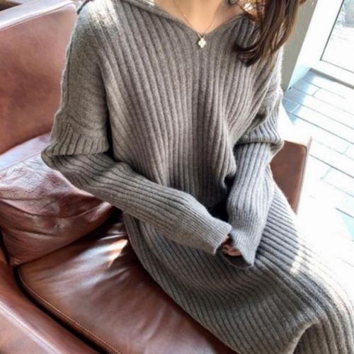MINA STYLE 브이넥 원피스 니트 롱 옆트임 여성 긴팔 데일리룩