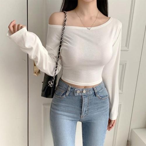 [신상오픈런]여성 오프숄더 슬림핏 크롭 티셔츠 가을용 무지 (41564470)