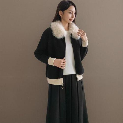 [신상오픈런]여성 퍼카라 배색 니트 집업 가디건 포켓 가을 자켓
