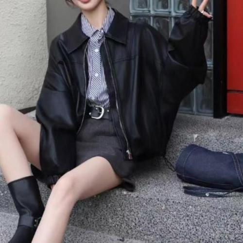 봄 가을 여성 가죽 자켓 숏 봄 가을 캐주얼 합성 가죽 항공 점퍼 오버사이즈 소매 JS