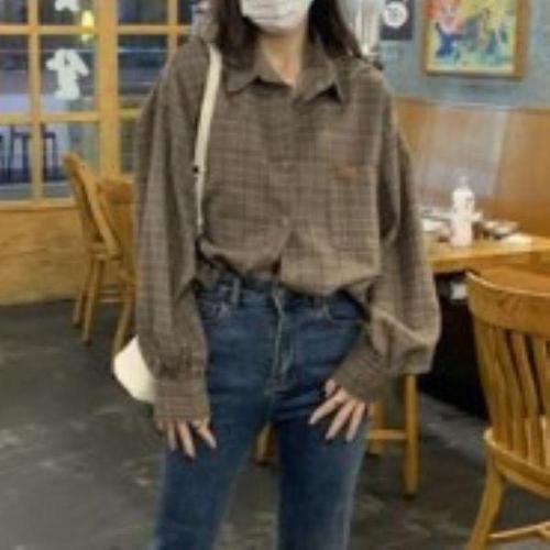 [옷자락]여성 갈색 체크 긴팔 셔츠 가을 캠퍼스 스타일 루즈핏