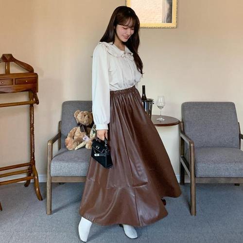 [신상오픈런]레더 a라인 맥시 플레어 밴딩 검정치마 훌스커트 (29411977)
