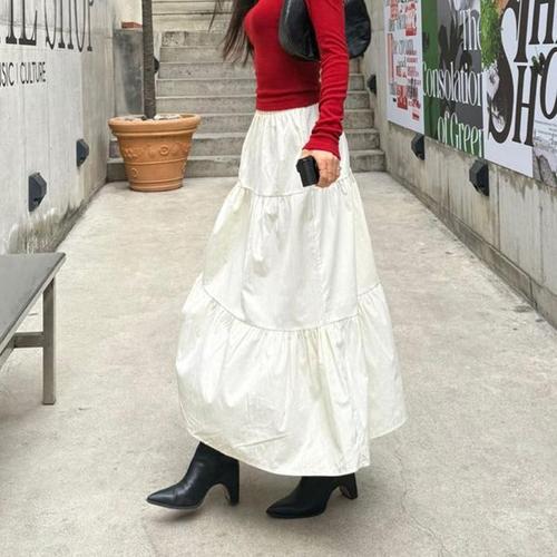 더플로우커머스 여성용 플로우폼 허리밴딩 플리츠 패치 편안한 롱스커트