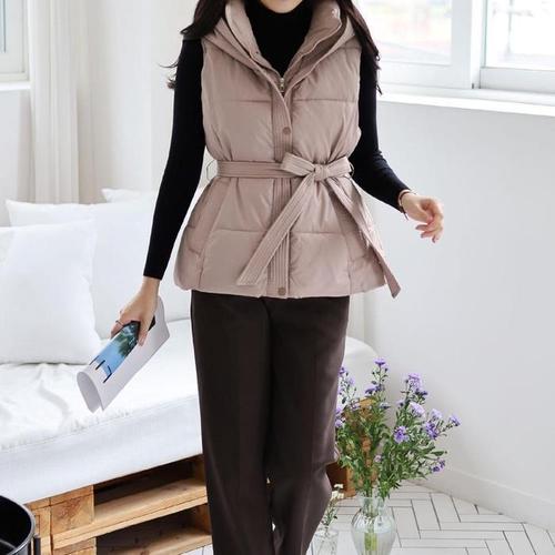 [신상오픈런]여성용 겨울 리본 장식 하이넥 후드 패딩 조끼 (41563946)