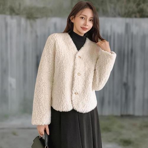 [신상오픈런]여성 금속 버튼 겨울 시즌 브이넥 덤블 뽀글이 자켓 (42636340)