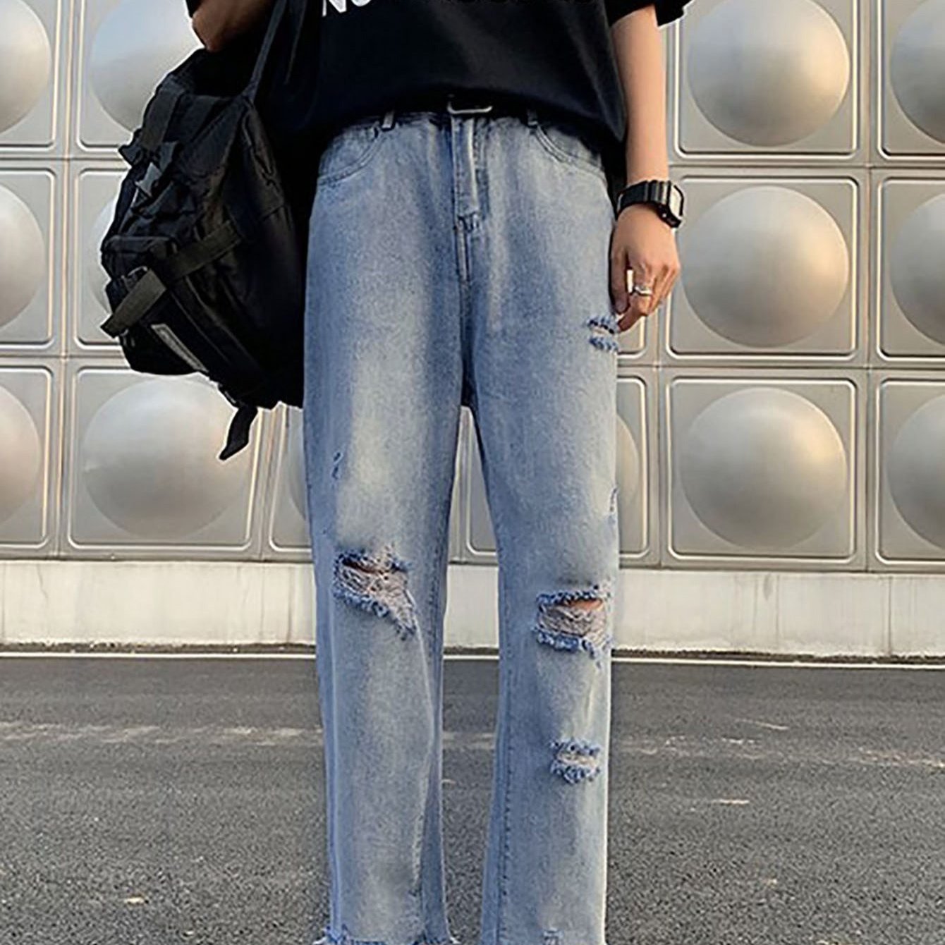 TEMU 남성 여름 찢어진 청바지 9부 와이드 일자 팬츠 블루 모던 컴포트 데님 팬츠 면 혼방 빅 사이즈