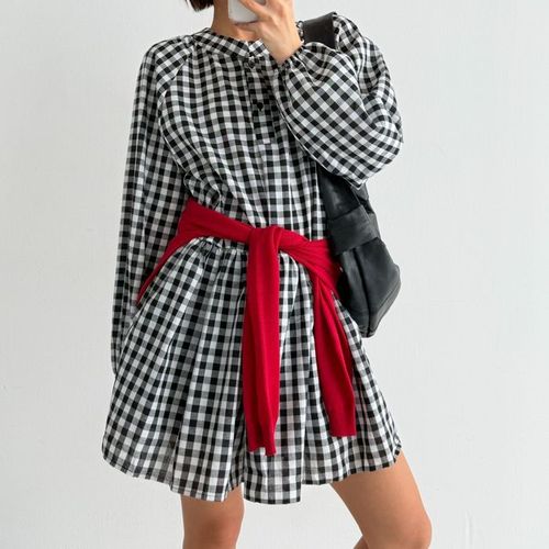 옷자락 / 여자 고방체크 나그랑 버튼 플레어 퍼프 면 미니원피