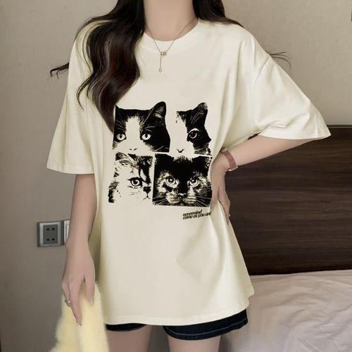 투니스 여성 고양이 프린팅 루즈핏 반소매 티셔츠