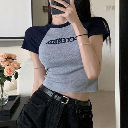 [셀러허브_여성트랜드패션]여자 여름티셔츠 크롭 배색 나그랑 슬림핏 골지 반팔
