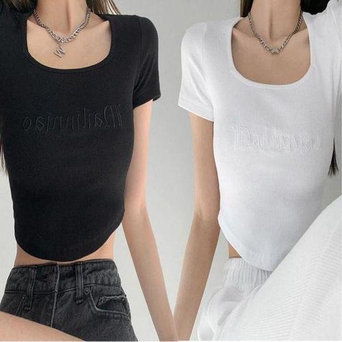 [셀러허브_여성트랜드패션]여자 슬림핏 스퀘어넥 골지 티셔츠 크롭 Y2K 반팔