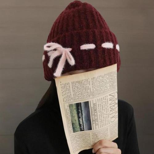 [신상오픈런]여성용 배색 핑크 리본 롤업 골지 울 니트 비니 (42009553)