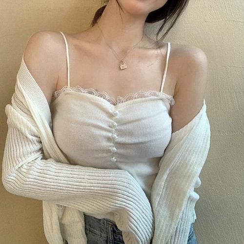 옷자락 / 여성 페미닌 데이트룩 레이스 리본 골지 슬림 끈탑