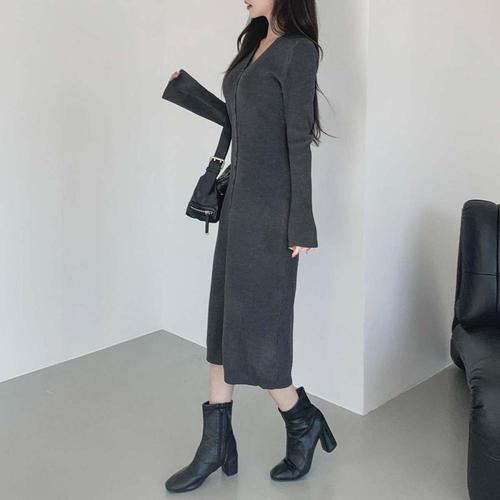 [다잇템]여성 롱 드레스 단추 골지슬림 V넥 앞트임
