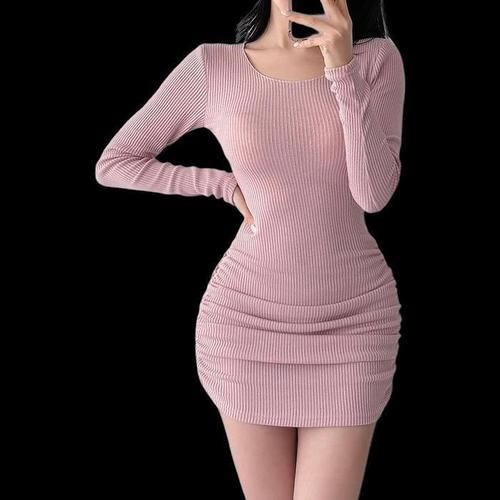 [신상오픈런]골지 사이드셔링 슬렌더룩 딱붙 얇은긴팔 미니원피스 (31804327)