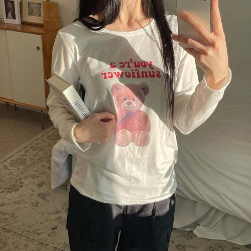 [험블] 곰돌이 캐릭터 프린팅 라운드 여성면티 긴팔티셔츠