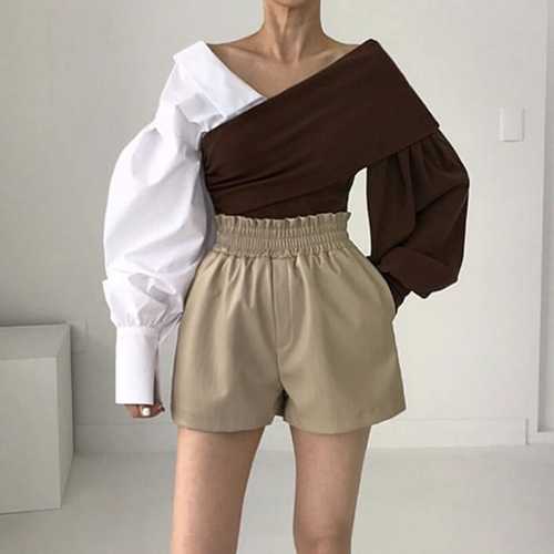 TEMU 여성용 2-in-1 룩 오프숄더 셔츠 탑, 봄 루즈핏, 은은한 패치워크가 있는 고급 디자인, 트렌디한 블라우스