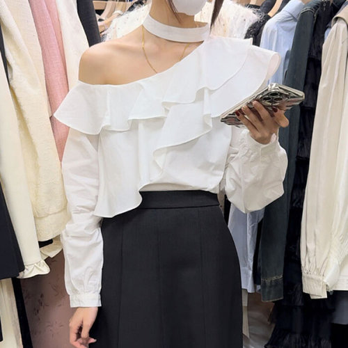 슈팅스타 / 오프숄더 홀더넥 프릴 유니크 숏 크롭 베이직블라우스
