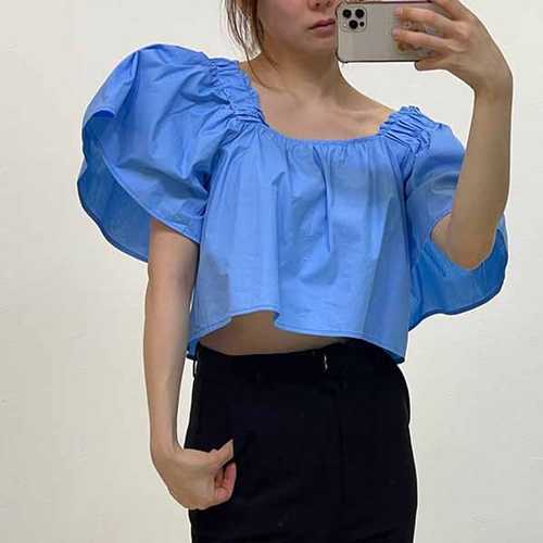 옷자락 / 여성 오프숄더 셔링 퍼프 벌룬 크롭 블라우스