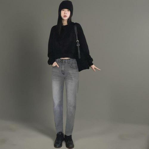 양털 안감 두꺼운 하이 웨이스트 슬림 피트 부츠컷 청바지 여성용 아메리칸 스타일 블랙 그레이 데님 바지 가을 겨울 패션