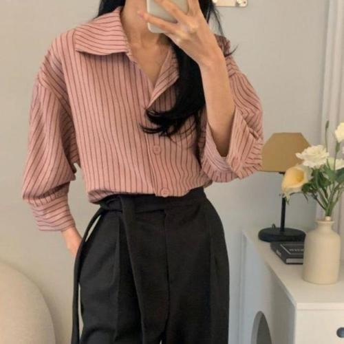 [신상오픈런]스트라이프셔츠 여성 올리브그린 봄코디 팔부남방 (29252252)