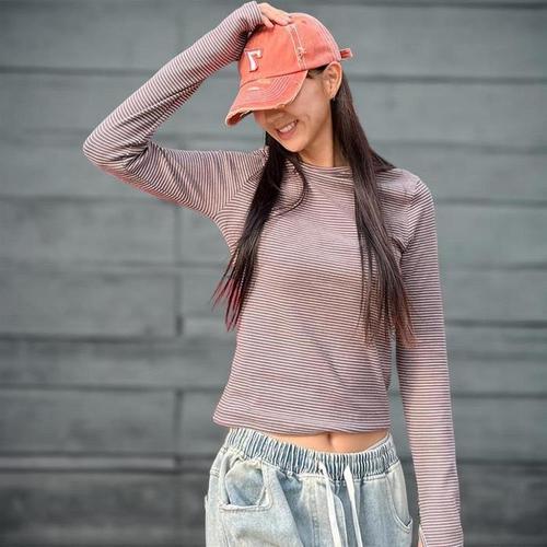 [신상오픈런]여성 기모 스트라이프 나그랑 슬림 크롭 티셔츠 (42636354)