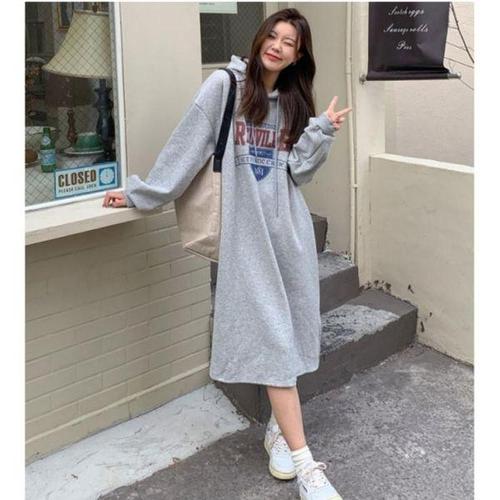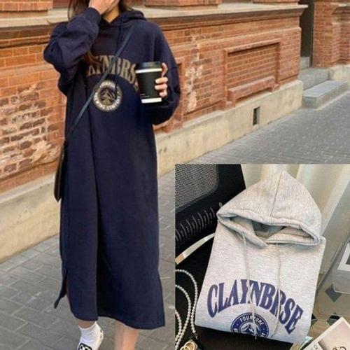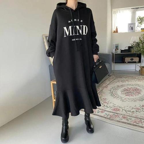 [에이치플러스몰]여성 겨울 레터링 기모 후드 롱 원피스