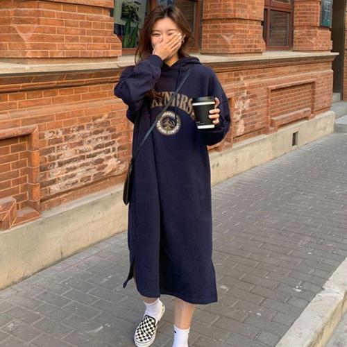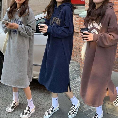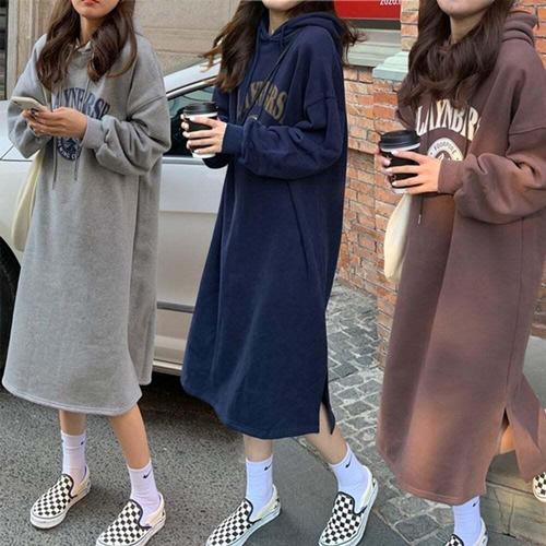 리파니 루즈핏 맨투맨 옆트임 기모 후드 롱 원피스
