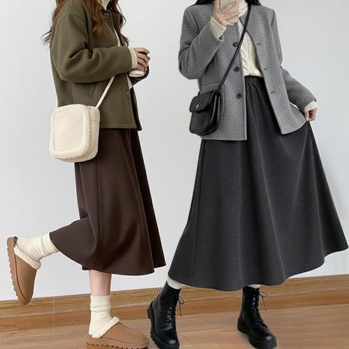 부엉구구 여성 겨울 루즈핏 허리 밴딩 H라인 하프 기장 기모 롱 치마 롱 스커트 OW0156A
