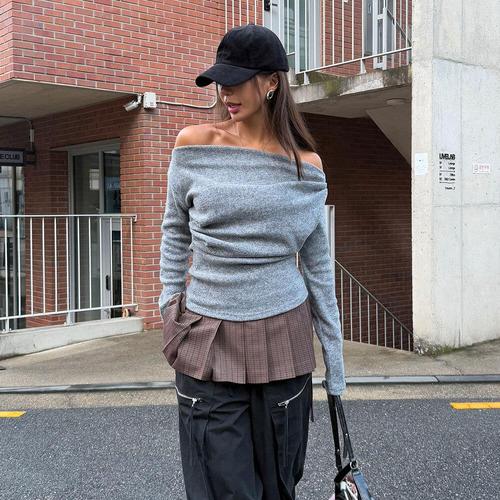 [신상오픈런]여자 드레이프 오프숄더 슬림핏 기모 롱슬리브 티셔츠