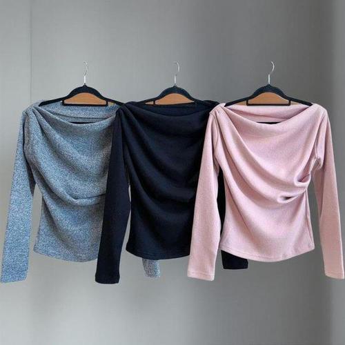 [신상오픈런]여자 드레이프 오프숄더 슬림핏 기모 롱슬리브 티셔츠
