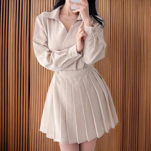 여자 클래식 랩 셔츠 플리츠 미니 원피스