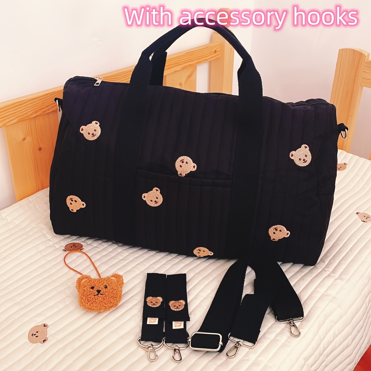 TEMU 1개 대형 블랙 장식 보스마우스 기저귀 가방 - 다기능 여행 핸드백, 넉넉한 내부 포켓, 유아, 청소년 및 성인용 (수하물)