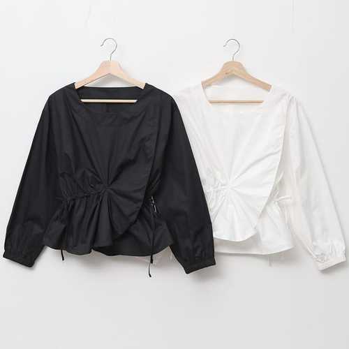 옷자락 / 여자 가을하객룩 언발 스트링 꼬임 러플 랩 블라우스