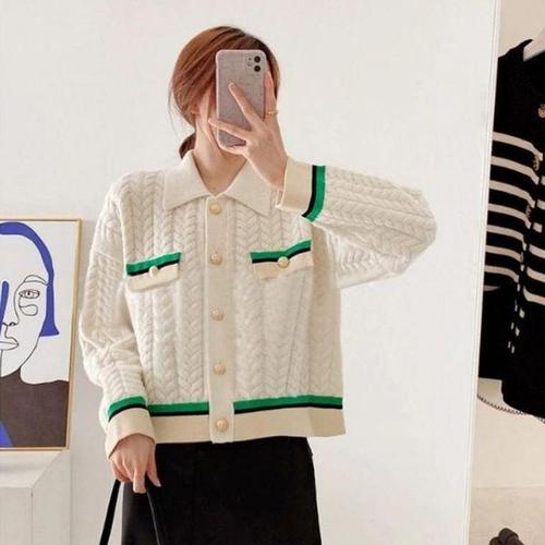 [에이치플러스몰]여성 배색 포인트 예쁜 꽈배기 패턴 카라 니트 가디건 체크 여성 니트 라운드 가을 크롭..