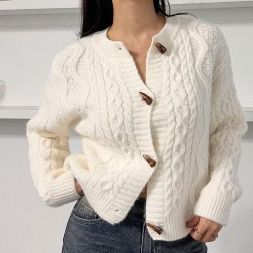 [옷자락] 여자 토글버튼 라운드넥 꽈배기 울니트 와플 가디건