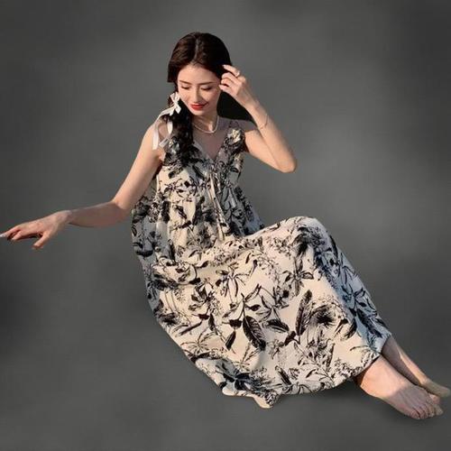 [신상오픈런]꽃무늬 시스루 리본 롱타이 끈나시 민소매원피스 (31804330)