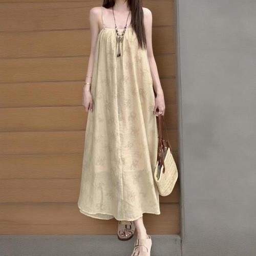 (신상 추천) 150kg까지 빅사이즈 1+1 여성 민소매 프렌치 입체 플리츠 끈나시 원피스 여름 편한 심플 스퀘어넥 등이드러난 우아한 모던 이너 매력 외출용 플레어 롱 원피스