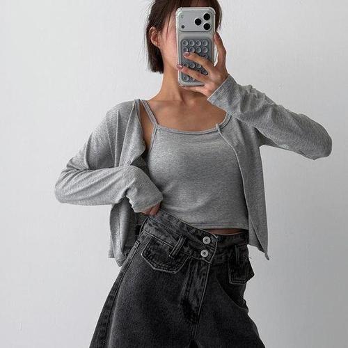 [셀러허브_여성트랜드패션]여자 크롭 끈나시 이너 무지 가디건 세트