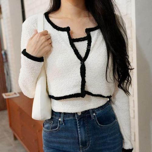 [다잇템]여자 보들 테리 라인 끈나시 크롭 가디건 세트