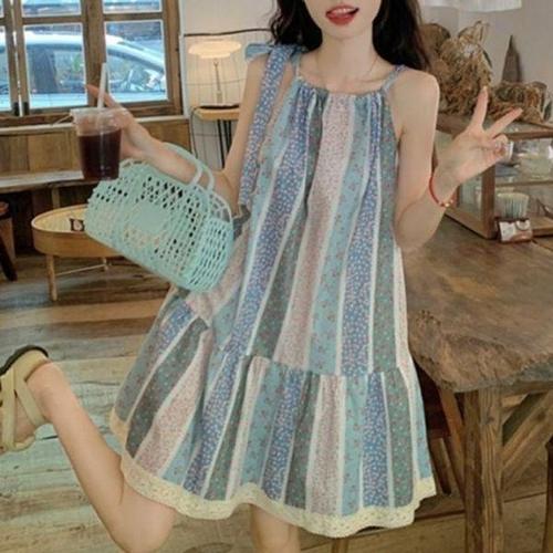 미중 여성 여름 뉴 선녀 바다 휴양지 허리조임 날씬 A라인 플라워 끈나시 기품 쇼트 원피스 cxyf