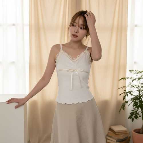옷자락 / 여자 페미닌 데이트룩 레이스 리본 골지 슬림 끈나시