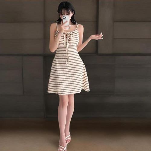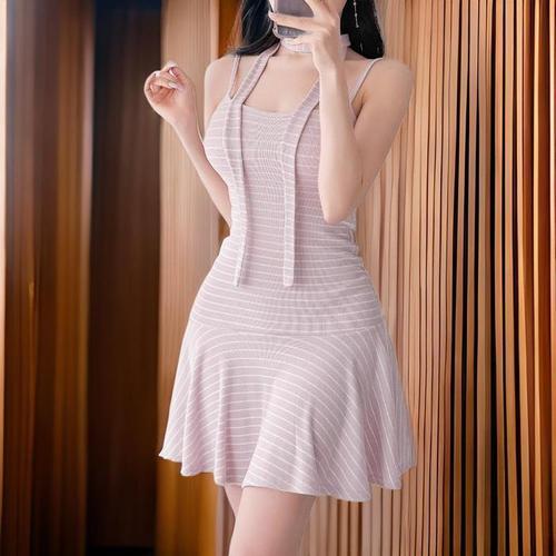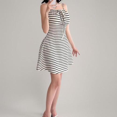 [신상오픈런]여성 스트라이프 넥타이 어깨끈 플레어 짧은 원피스 (32966198)