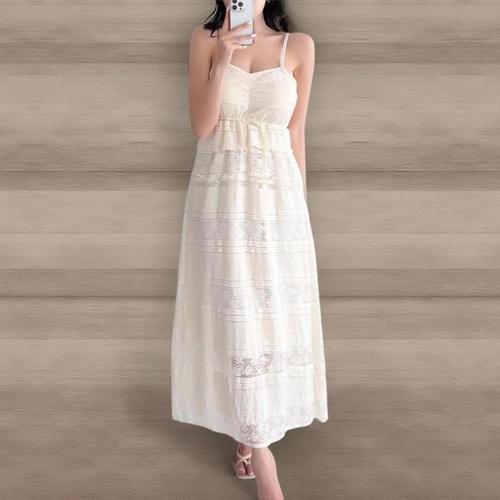 [신상오픈런]여성 레이스 레이어드 슬림핏 H라인 끈 긴 원피스 (41992524)