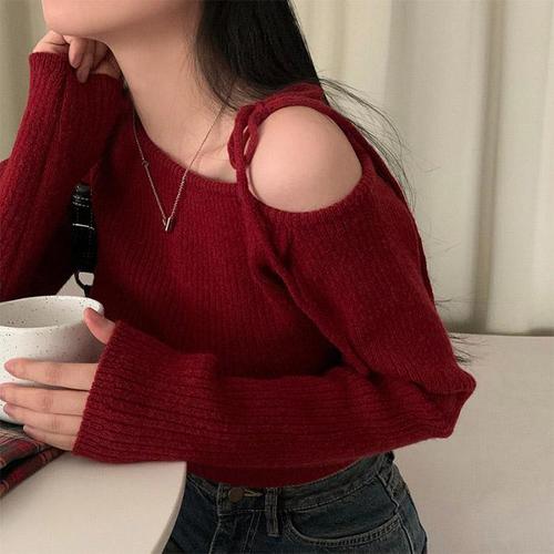 [옷자락]여성 오프숄더 셔링 어깨 리본끈 슬림핏 니트