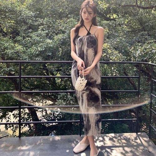 [에이치플러스몰]마블링 인기 그레이 여성 끈나시 감성 롱 원피스 여름