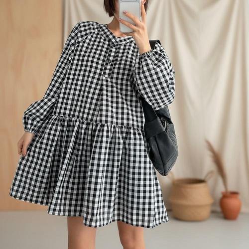 여성 벌룬 격자 라글란 쁘띠 원피스